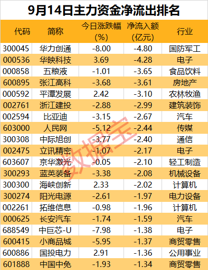 另外,五粮液、张江高科、浙江建投、比亚迪、人民网等主力资金均大幅净流出。
