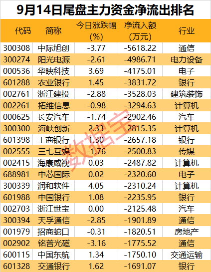 算力龙头股中际旭创尾盘流出资金超5600万元,排在首位。作为CPO龙头股,该股自6月的最高价以来,大幅回调超35%。