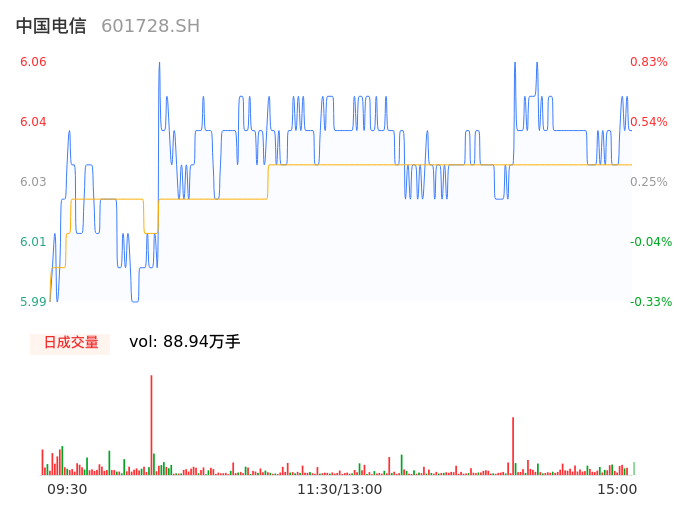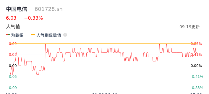 09月19日,中国电信收报6.03,股价涨幅0.33%,成交金额5.36亿元,换手率0.45%。