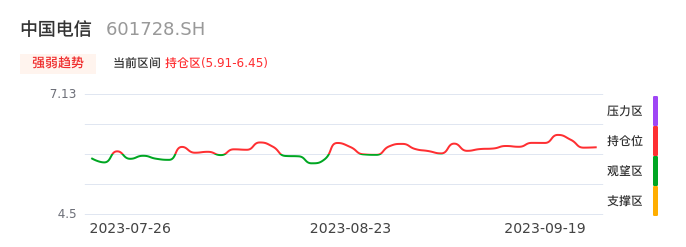 我们来看一下该股的九方特色指标强弱趋势的情况:中国电信自08月28日从观望区上穿到持仓区。股价近期在多头区域持续强势上扬,上升动能仍较为充足,可积极关注。后续重点关注上方压力位:6.45元是否能突破上攻。