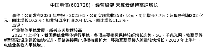 值得注意的是:2023年09月中原证券的唐俊男/李璐毅分析师,首次发布关于中国电信的研究报告,标题为:中国电信(601728):经营稳健 天翼云保持高速增长。