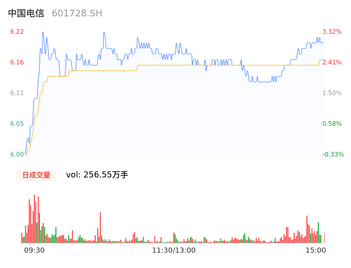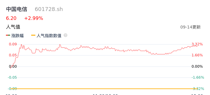 09月14日,中国电信收报6.20,股价涨幅2.99%,成交金额15.82亿元,换手率1.31%。