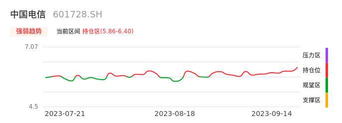 我们来看一下该股的九方特色指标强弱趋势的情况:中国电信自08月28日从观望区上穿到持仓区。股价近期在多头区域持续强势上扬,上升动能仍较为充足,可积极关注。后续重点关注上方压力位:6.40元是否能突破上攻。