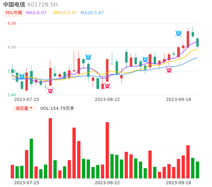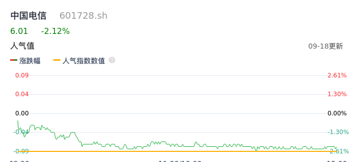 09月18日,中国电信收报6.01,股价涨幅-2.12%,成交金额9.32亿元,换手率0.79%。
