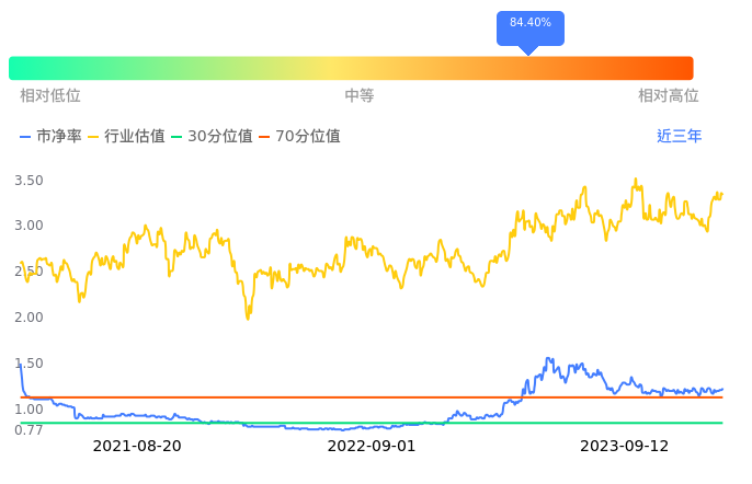 中国电信当前市净率PB为1.27,在所属的通信服务中,市净率PB排3,前五名分别为中国联通市净率1.05、ST信通市净率1.12、中国电信市净率1.27、光环新网市净率1.49、中国移动市净率1.64。中国电信当前市净率PB为1.23,超过近3年84.40%的历史数据。
