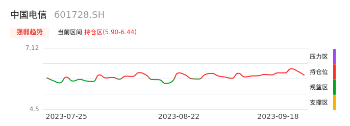 我们来看一下该股的九方特色指标强弱趋势的情况:中国电信自08月28日从观望区上穿到持仓区。股价近期在多头区域回调整理。后续重点关注多空分界点的争夺:5.90元。如未能有效站稳则可能重新回到空头行情。