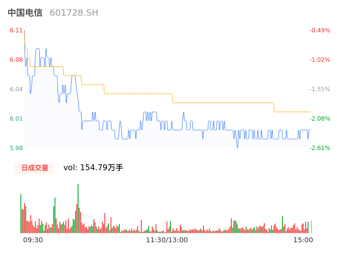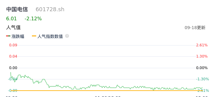 09月18日,中国电信收报6.01,股价涨幅-2.12%,成交金额9.32亿元,换手率0.79%。