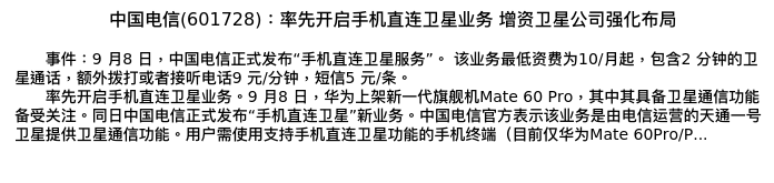 值得注意的是:2023年09月长城证券的侯宾分析师,首次发布关于中国电信的研究报告,标题为:中国电信(601728):率先开启手机直连卫星业务 增资卫星公司强化布局。