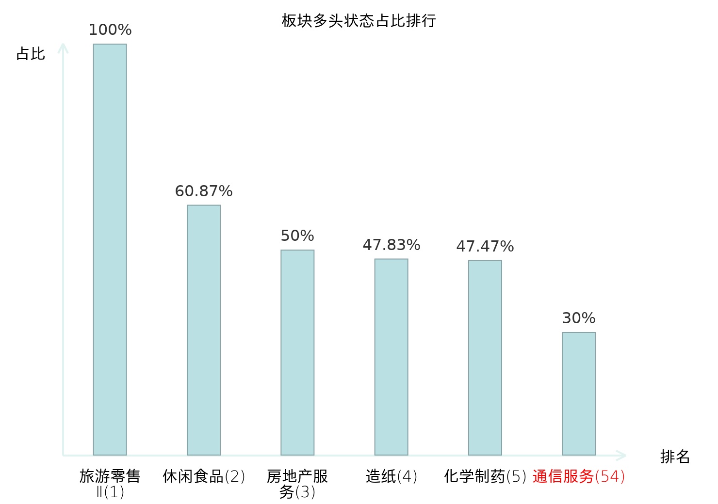 全市场所有行业板块中主力多头状态占比排名中,旅游零售Ⅱ板块位居第一。种植业板块名次提升最快,较昨日上升49位。