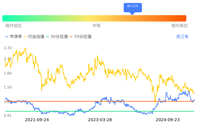 中国中车当前市净率PB为1.30,在所属的轨交设备中,市净率PB排13,前五名分别为天宜上佳市净率0.56、中铁工业市净率0.65、威奥股份市净率0.74、九州一轨市净率0.95、今创集团市净率1.11。中国中车当前市净率PB为1.26,超过近3年86.21%的历史数据。