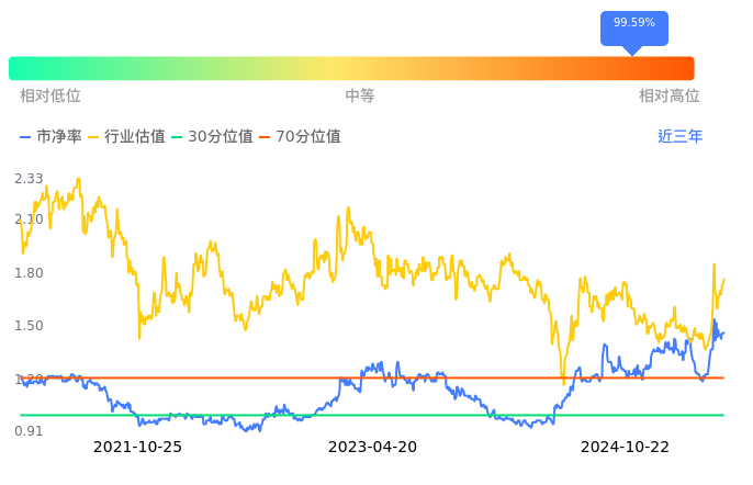 中国中车当前市净率PB为1.52,在所属的轨交设备中,市净率PB排10,前五名分别为天宜上佳市净率0.75、中铁工业市净率0.79、威奥股份市净率0.91、九州一轨市净率1.09、今创集团市净率1.24。中国中车当前市净率PB为1.47,超过近3年99.59%的历史数据。