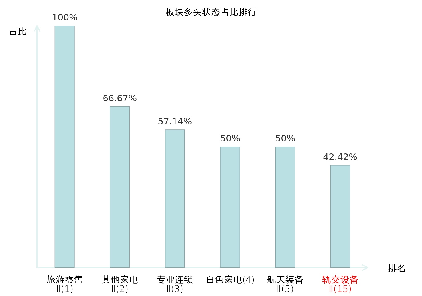 全市场所有行业板块中主力多头状态占比排名中,旅游零售Ⅱ板块位居第一。股份制银行Ⅱ板块名次提升最快,较昨日上升79位。