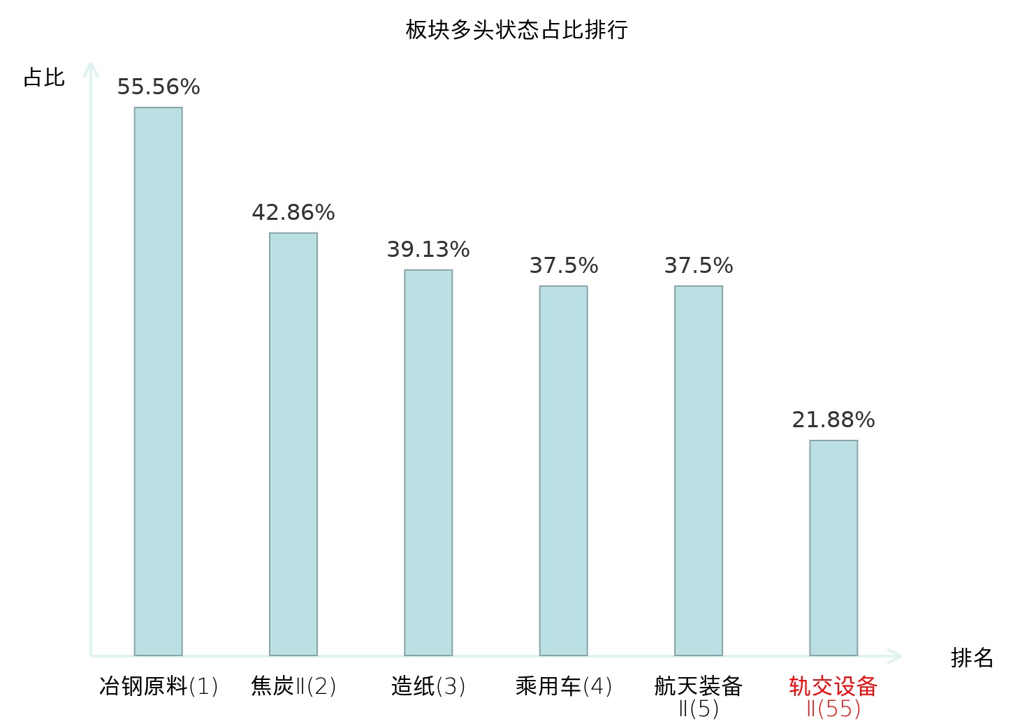 全市场所有行业板块中主力多头状态占比排名中,冶钢原料板块位居第一。房屋建设Ⅱ板块名次提升最快,较昨日上升84位。