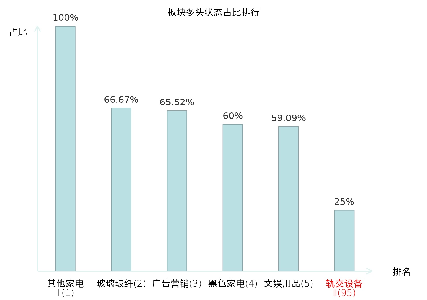 全市场所有行业板块中主力多头状态占比排名中,其他家电Ⅱ板块位居第一。体育Ⅱ板块名次提升最快,较昨日上升57位。