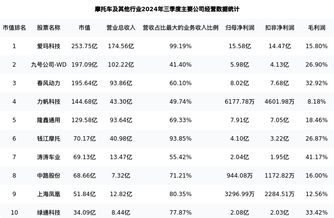 力帆科技最新报告期数据为三季度,下表汇总了摩托车及其他行业内市值靠前的公司三季度主要经营数据