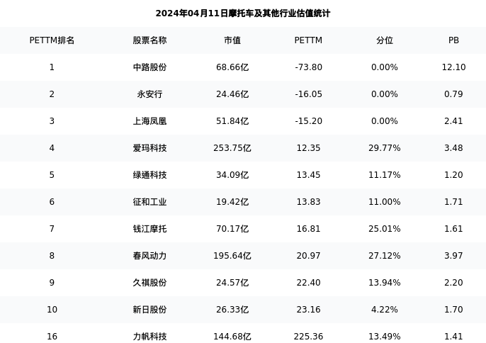从估值角度看:力帆科技最新市盈率PETTM为225.36,在行业内排名13/16,处于13.49分位。