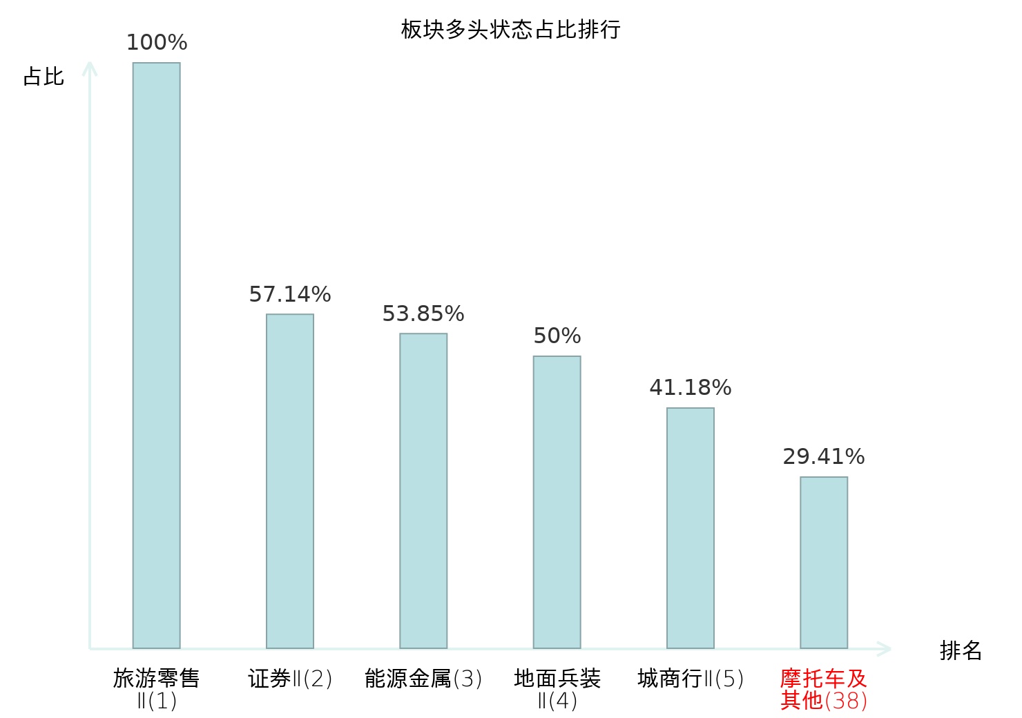 全市场所有行业板块中主力多头状态占比排名中,旅游零售Ⅱ板块位居第一。渔业板块名次提升最快,较昨日上升57位。