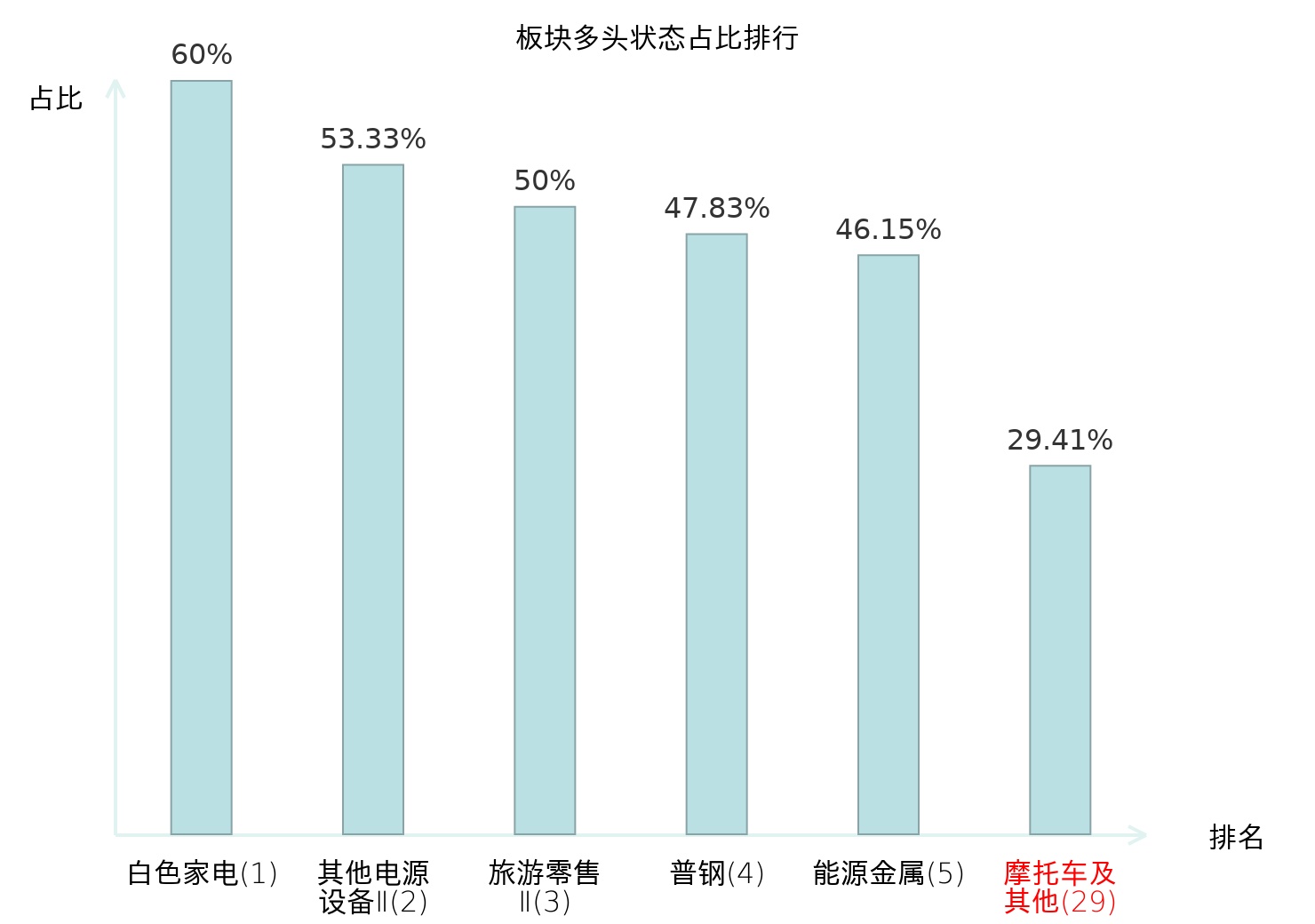 全市场所有行业板块中主力多头状态占比排名中,白色家电板块位居第一。照明设备Ⅱ板块名次提升最快,较昨日上升55位。