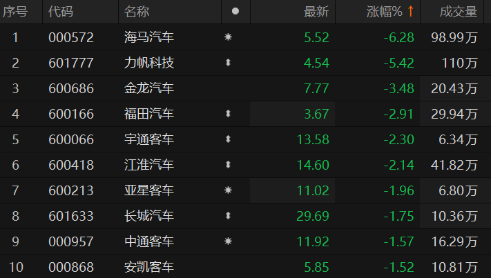 汽车整车股震荡下挫 海马汽车跌超6%