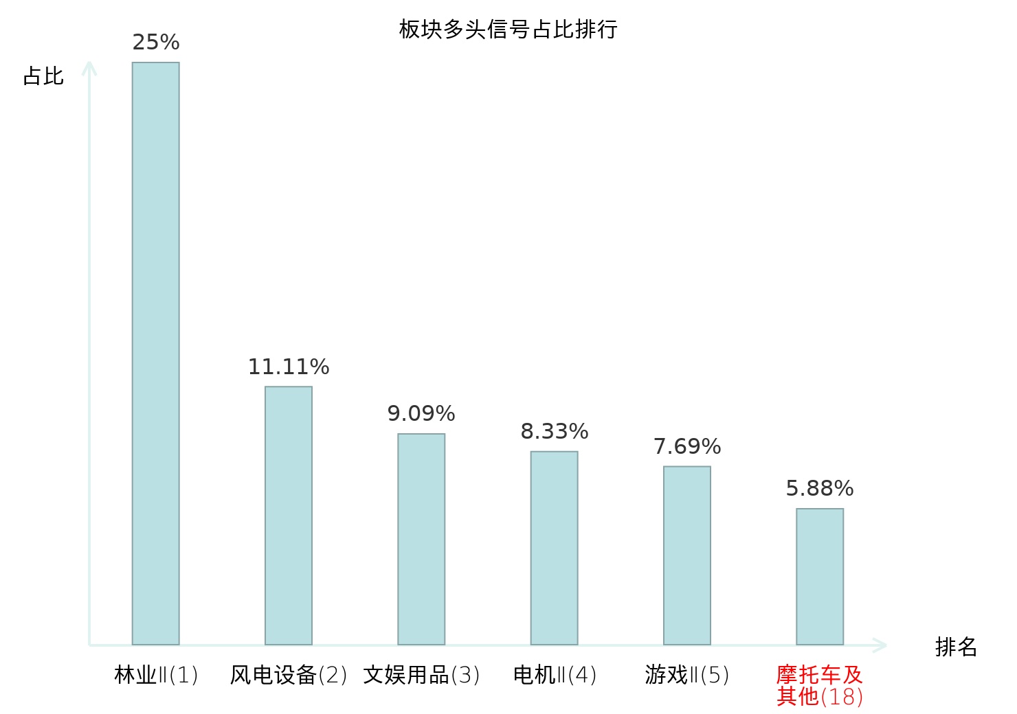 全市场所有行业板块中主力多头信号占比排名中,林业Ⅱ板块位居第一。林业Ⅱ板块名次提升最快,较昨日上升124位。