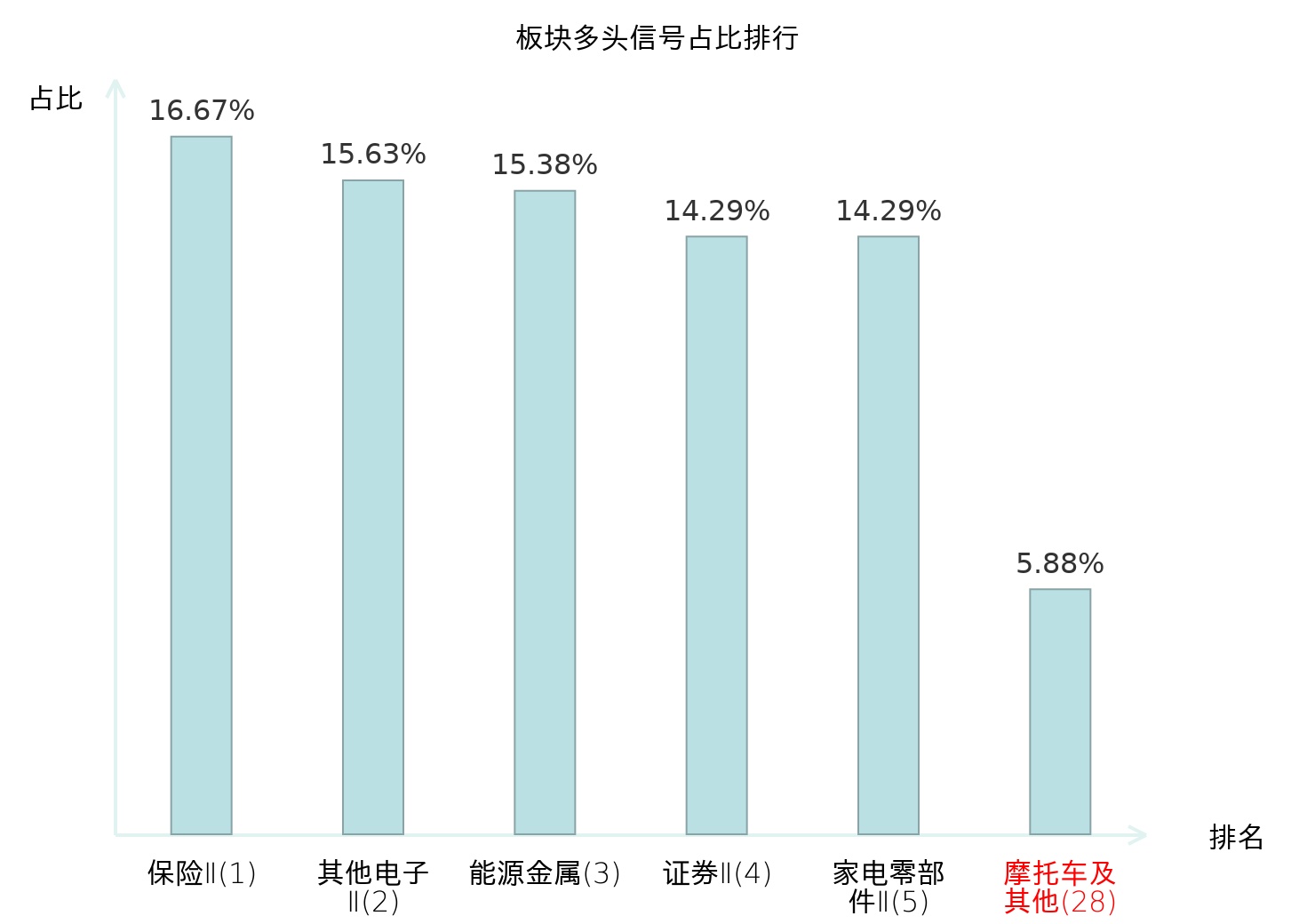 全市场所有行业板块中主力多头信号占比排名中,保险Ⅱ板块位居第一。城商行Ⅱ板块名次提升最快,较昨日上升97位。