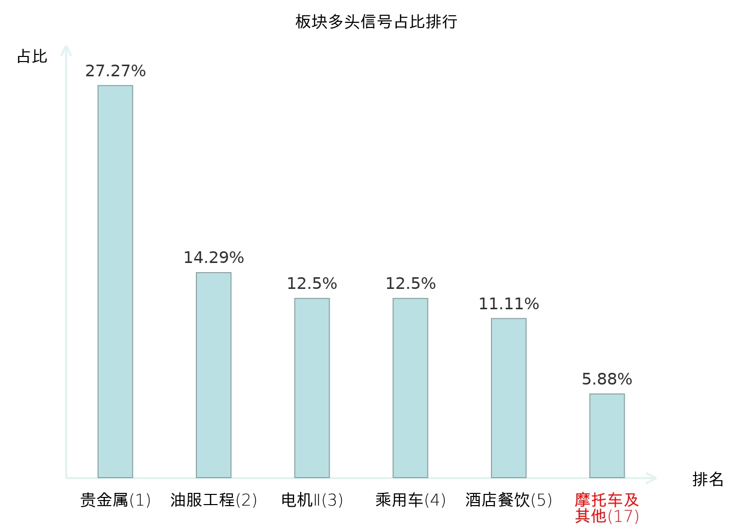 全市场所有行业板块中主力多头信号占比排名中,贵金属板块位居第一。乘用车板块名次提升最快,较昨日上升114位。
