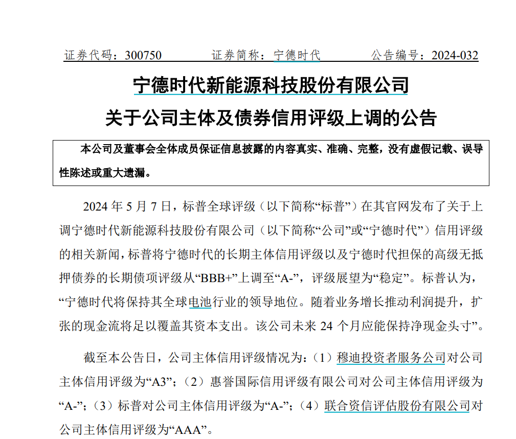 5月9日,宁德时代(300750)披露公告,5月7日,标普全球评级(以下简称“标普”)在其官网发布了关于上调宁德时代信用评级的信息。标普将宁德时代的长期主体信用评级以及宁德时代担保的高级无抵押债券的长期债项评级从“BBB+”上调至“A-”,评级展望为“稳定”。