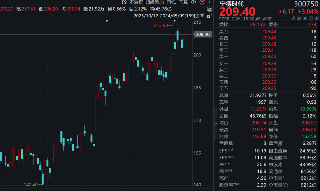 相关数据显示,5月9日宁德时代全天成交17.73亿元,成交净买入1.47亿元,为连续第8日净买入,其间该股获深股通累计成交158.45亿元,合计净买入28.58亿元。截至5月9日收盘,宁德时代报收209.40元/股,涨3.04%。