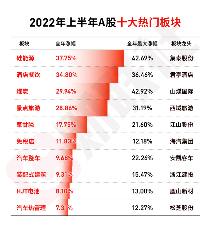 回望今年上半年,A股热点板块频出,硅能源、酒店餐饮、煤炭、景点旅游、草甘膦等板块先后粉墨登场,成为今年上半年投资者无法忽视的热点。其中,硅能源以37.75%的涨幅傲视全市场,除了硅能源板块之外,酒店餐饮、煤炭、景点旅游板块的上半年涨幅也均超过了20%,草甘膦、有机硅、免税店板块则上涨超10%。