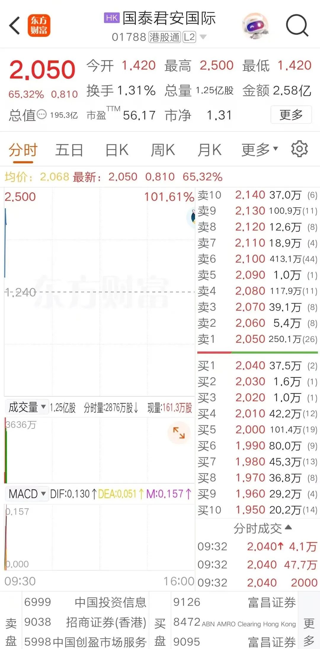 受此影响,港股全线高开,恒生指数开盘涨0.62%,恒生科技指数涨0.9%。其中,国泰君安国际开盘大涨超14%,盘中一度暴涨超100%,随后涨幅有所收窄,但涨幅仍超60%。