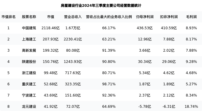 宁波建工最新报告期数据为三季度,下表汇总了房屋建设行业内市值靠前的公司三季度主要经营数据