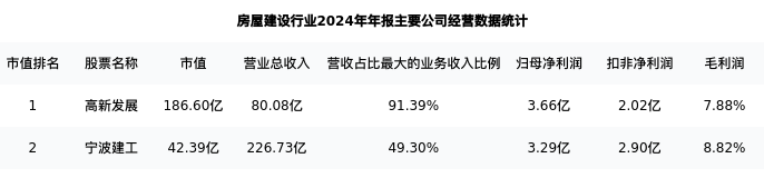 宁波建工最新报告期数据为年报,下表汇总了房屋建设行业内市值靠前的公司年报主要经营数据