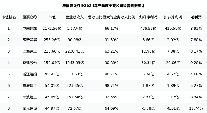 宁波建工最新报告期数据为三季度,下表汇总了房屋建设行业内市值靠前的公司三季度主要经营数据
