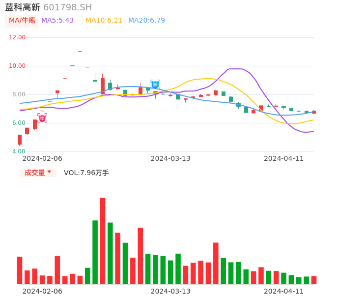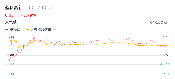 04月11日,蓝科高新收报6.83,股价涨幅1.79%,成交金额5431.90万元,换手率2.25%。
