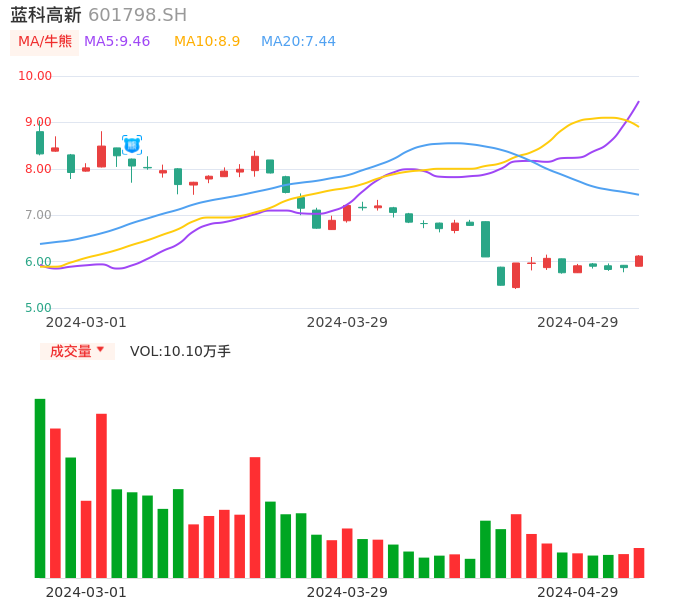 04月29日,蓝科高新收报6.12,股价涨幅4.26%,成交金额6103.99万元,换手率2.85%。
