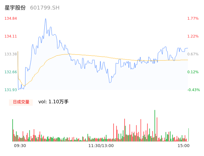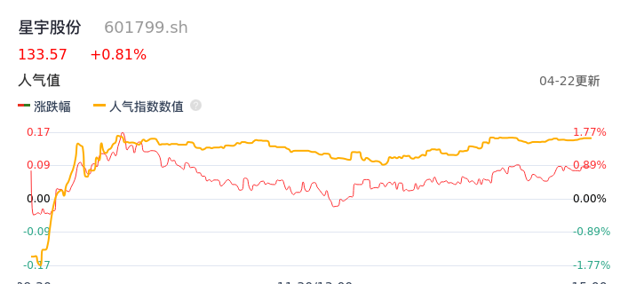 04月22日,星宇股份收报133.57,股价涨幅0.81%,成交金额1.46亿元,换手率0.38%。