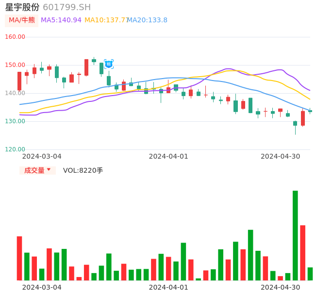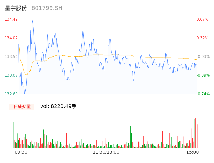 04月30日,星宇股份收报133.35,股价涨幅-0.18%,成交金额1.10亿元,换手率0.29%。