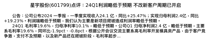 值得注意的是:2024年04月上海申银万国证券研究所的樊夏沛分析师,首次发布关于星宇股份的研究报告,标题为:星宇股份(601799)点评:24Q1利润略低于预期 不改新客户周期已开启。