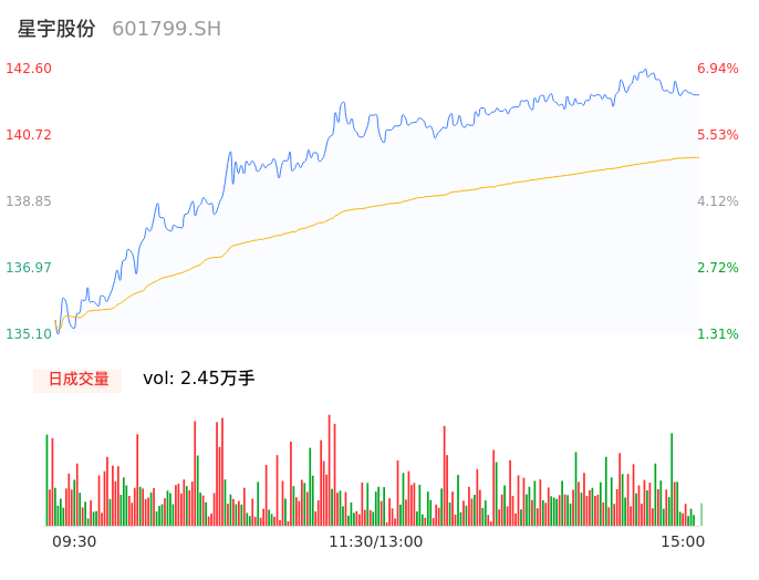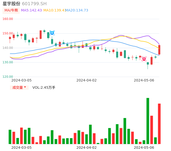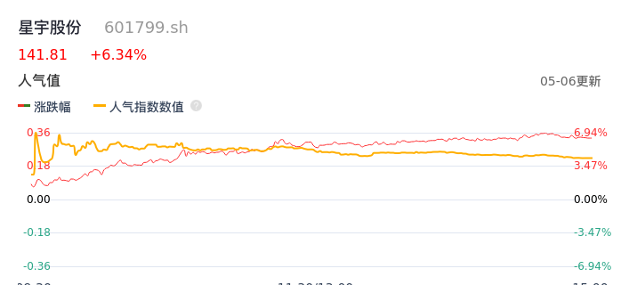 05月06日,星宇股份收报141.81,股价涨幅6.34%,成交金额3.43亿元,换手率0.86%。
