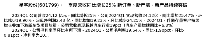 值得注意的是:2024年04月国信证券的唐旭霞/杨钐分析师,首次发布关于星宇股份的研究报告,标题为:星宇股份(601799):一季度营收同比增长25% 新订单、新产能、新产品持续突破。