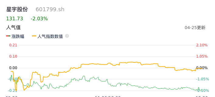 04月25日,星宇股份收报131.73,股价涨幅-2.03%,成交金额9023.78万元,换手率0.24%。