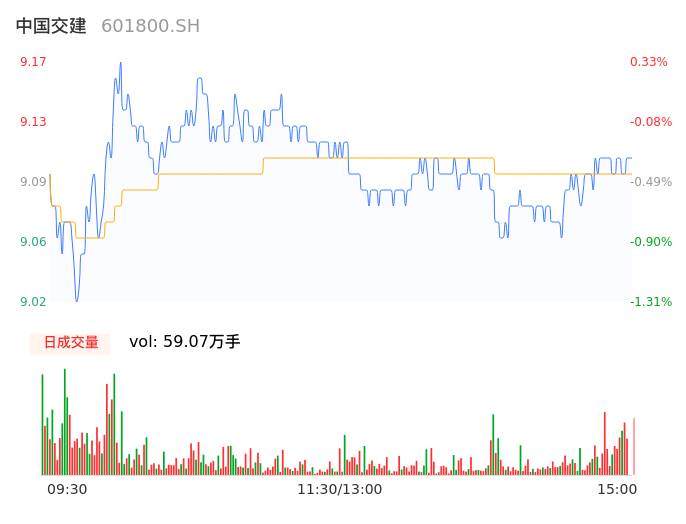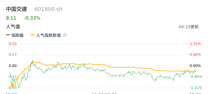 04月25日,中国交建收报9.11,股价涨幅-0.33%,成交金额5.38亿元,换手率0.50%。