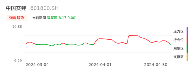 我们来看一下该股的九方特色指标强弱趋势的情况:中国交建近日从持仓区下穿到观望区,股价出现持续性调整行情。短期已经转为空头行情,且下跌动能仍未衰竭。建议继续谨慎观望。