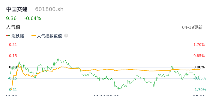 04月19日,中国交建收报9.36,股价涨幅-0.64%,成交金额11.07亿元,换手率1.00%。