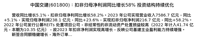值得注意的是:2024年04月国信证券的任鹤/朱家琪分析师,首次发布关于中国交建的研究报告,标题为:中国交建(601800):扣非归母净利润同比增长58% 投资结构持续优化。