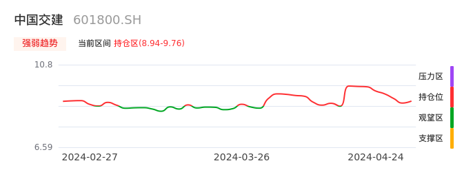 我们来看一下该股的九方特色指标强弱趋势的情况:中国交建自04月15日从观望区上穿到持仓区。股价近期在多头区域持续强势上扬,上升动能仍较为充足,可积极关注。后续重点关注上方压力位:9.76元是否能突破上攻。