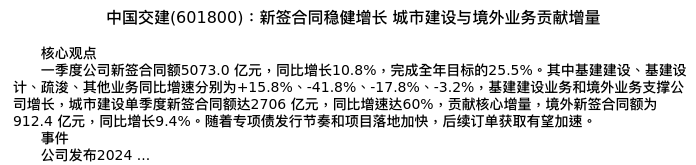 值得注意的是:2024年04月中信建投证券的竺劲分析师,首次发布关于中国交建的研究报告,标题为:中国交建(601800):新签合同稳健增长 城市建设与境外业务贡献增量。