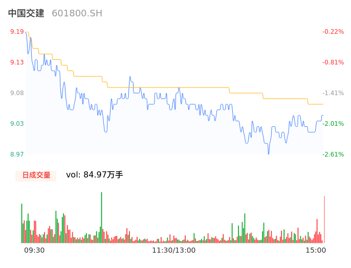 04月23日,中国交建收报9.04,股价涨幅-1.85%,成交金额7.70亿元,换手率0.72%。