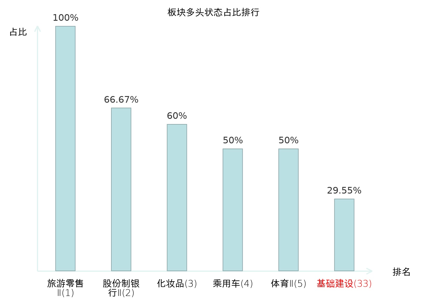 全市场所有行业板块中主力多头状态占比排名中,旅游零售Ⅱ板块位居第一。旅游零售Ⅱ板块名次提升最快,较昨日上升130位。