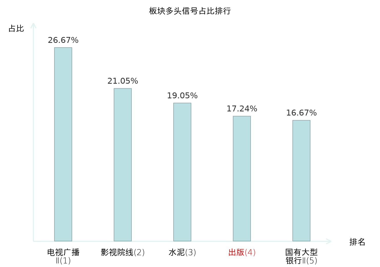 全市场所有行业板块中主力多头信号占比排名中,电视广播Ⅱ板块位居第一。国有大型银行Ⅱ板块名次提升最快,较昨日上升118位。